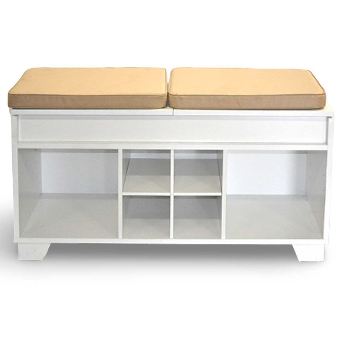 four cubbies, two large cubbies, 2 padded cushions