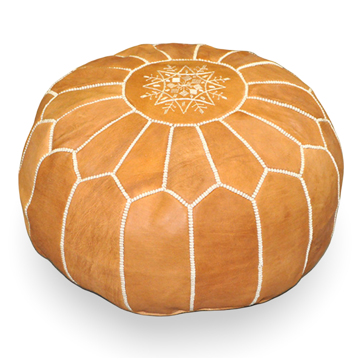 Pouf, Goat Leather, tan with ivory stitched Moroccan design
