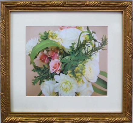 Gold wooden frame with white mat. Bridal bouquet with white roses, pink roses, and green leaves. Pink background.