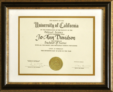 Bachelor degree in Political Science, gold/white double mat, black frame with gold leaf fillet and edge, size: 16" x 13"
