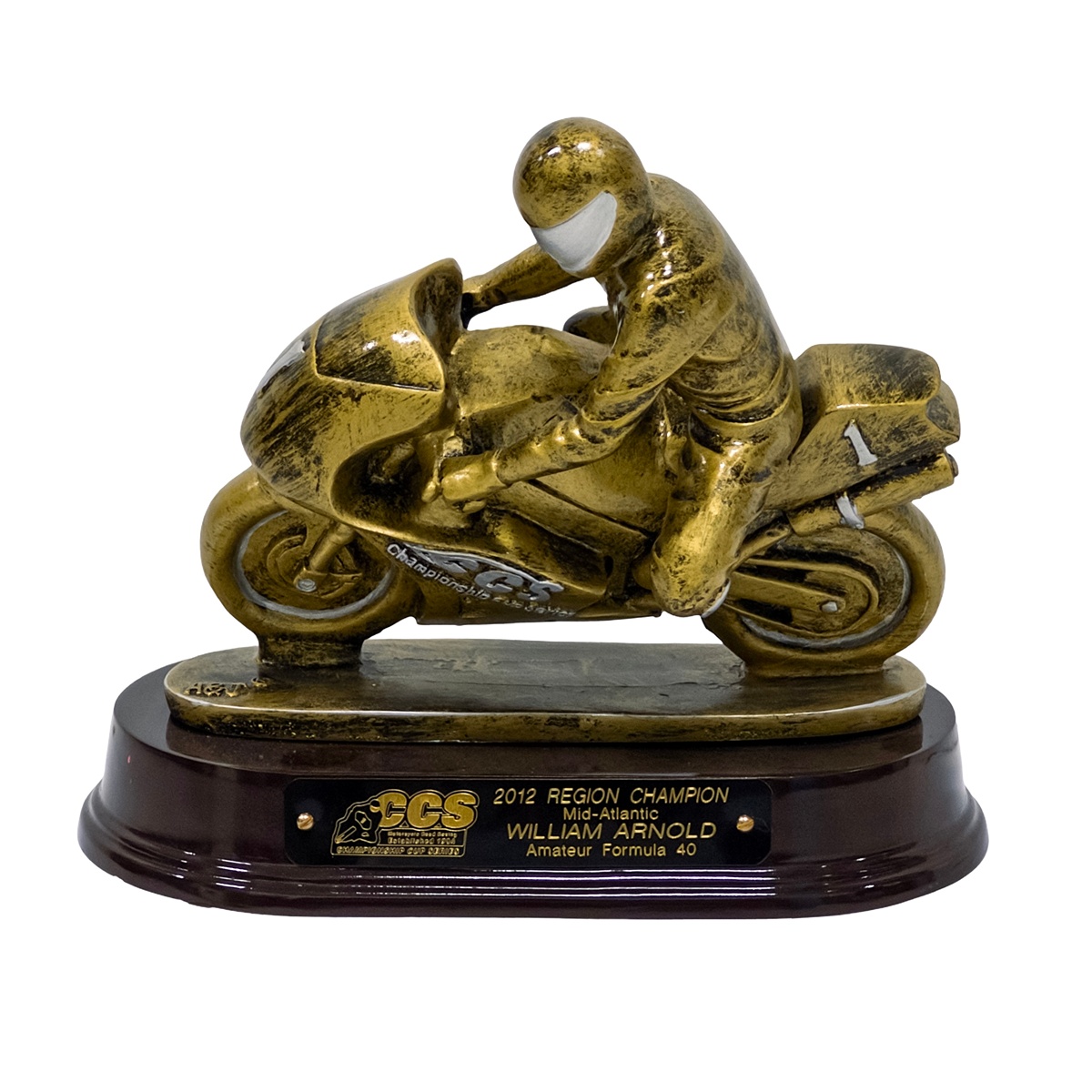 motorcycle and rider leaning at an angle, brass finish, engraved "2012 Region Champion"