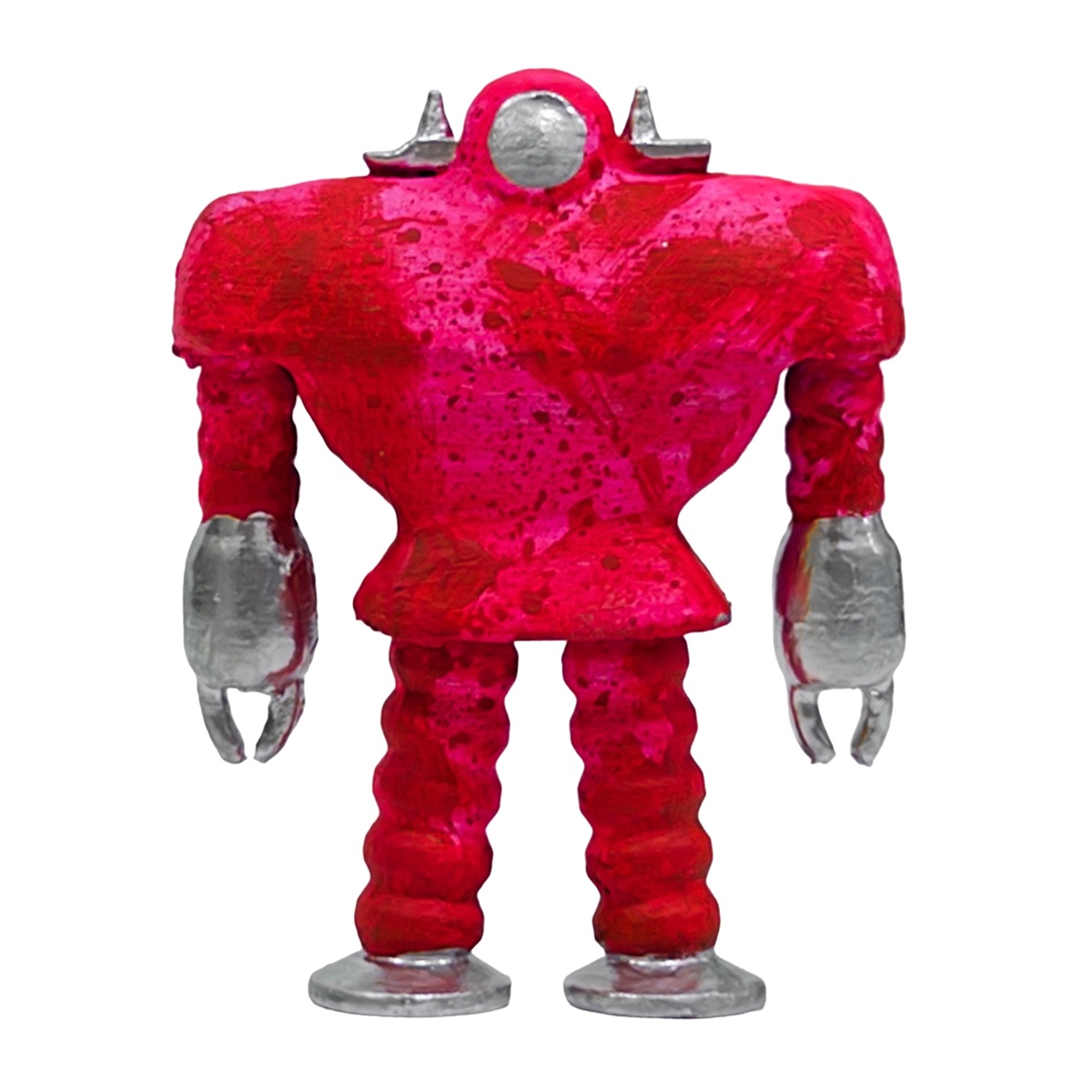 clamp hands, ribbed arms and legs, red splotches, silver face and trimmings, plastic figurine