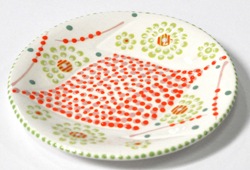 saucer; CLEARED white multicolored dot in a floral design; centered diamond of orange and pink dots