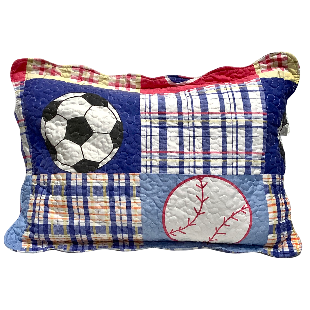 Quilted pillow, baseball in one corner, soccer ball in opposite corner, blue orange yellow and white plaid design, white squiggly stitching ...
