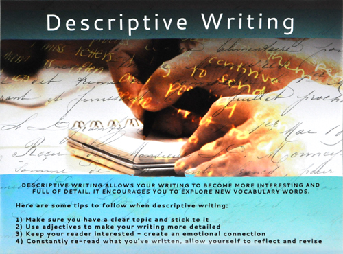 Picture of hands writing with various handwriting overlays. Dark blue and light blue background. "Descriptive Writing" in white font.