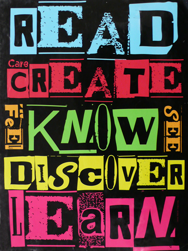 Mulitcolor list of words like "Read... Create... Know". Blue, red, green, yellow, orange, and pink text. Black background.