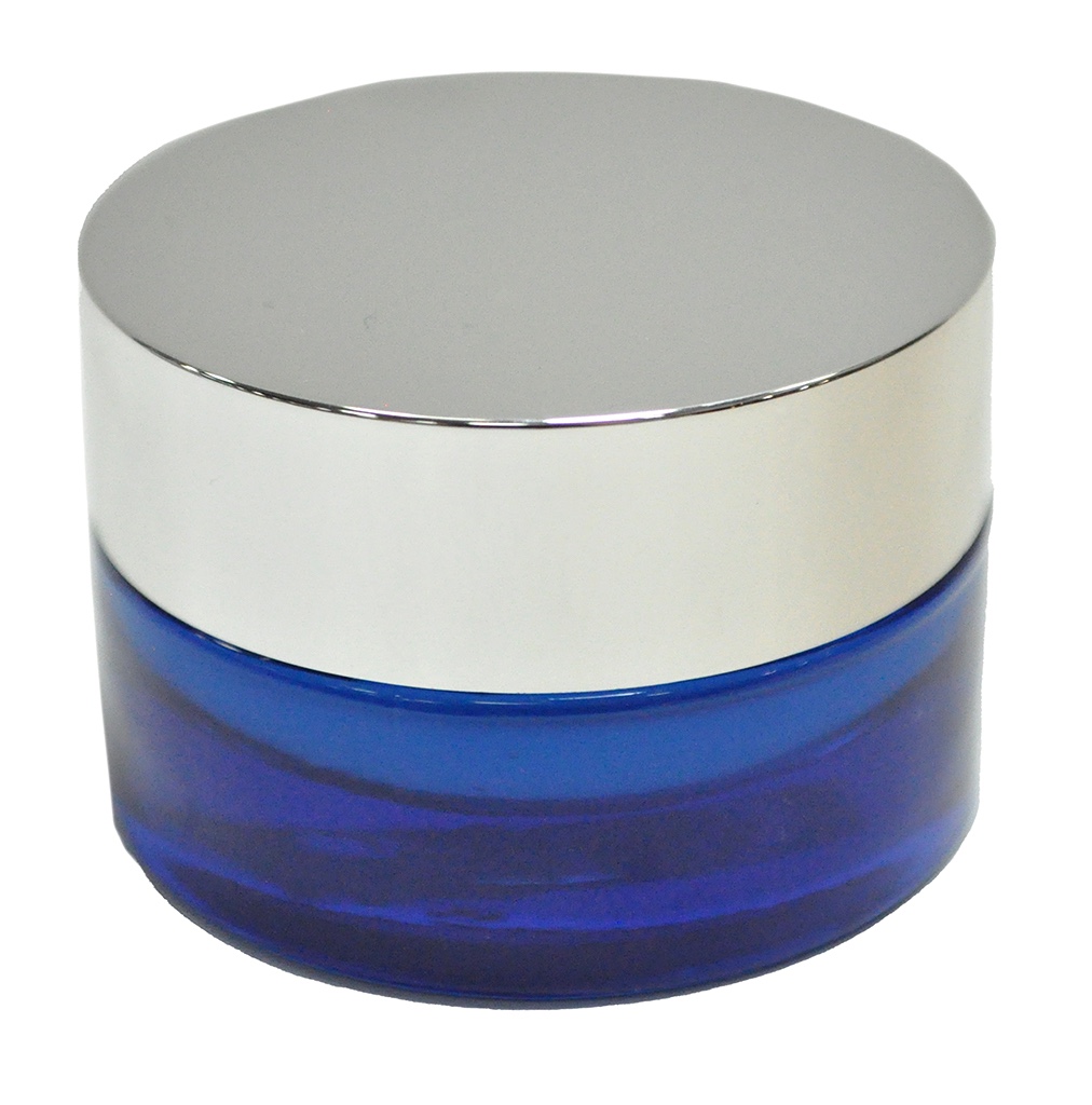 blue glass, ball bottle, chrome lid, may contain cream, etc.,