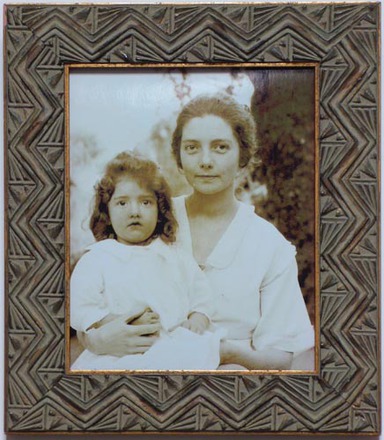 Worn wooden frame with triangular pattern and gold trim on the inside. Woman in white holding little girl in white.