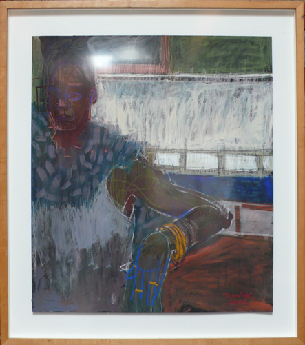 Maple frame with white mat. Pastel of woman, resting her arm. White and blue tones in the background.