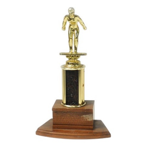 gold & brown pillar on teak pedestal, size: 4" x 3" x 10" H