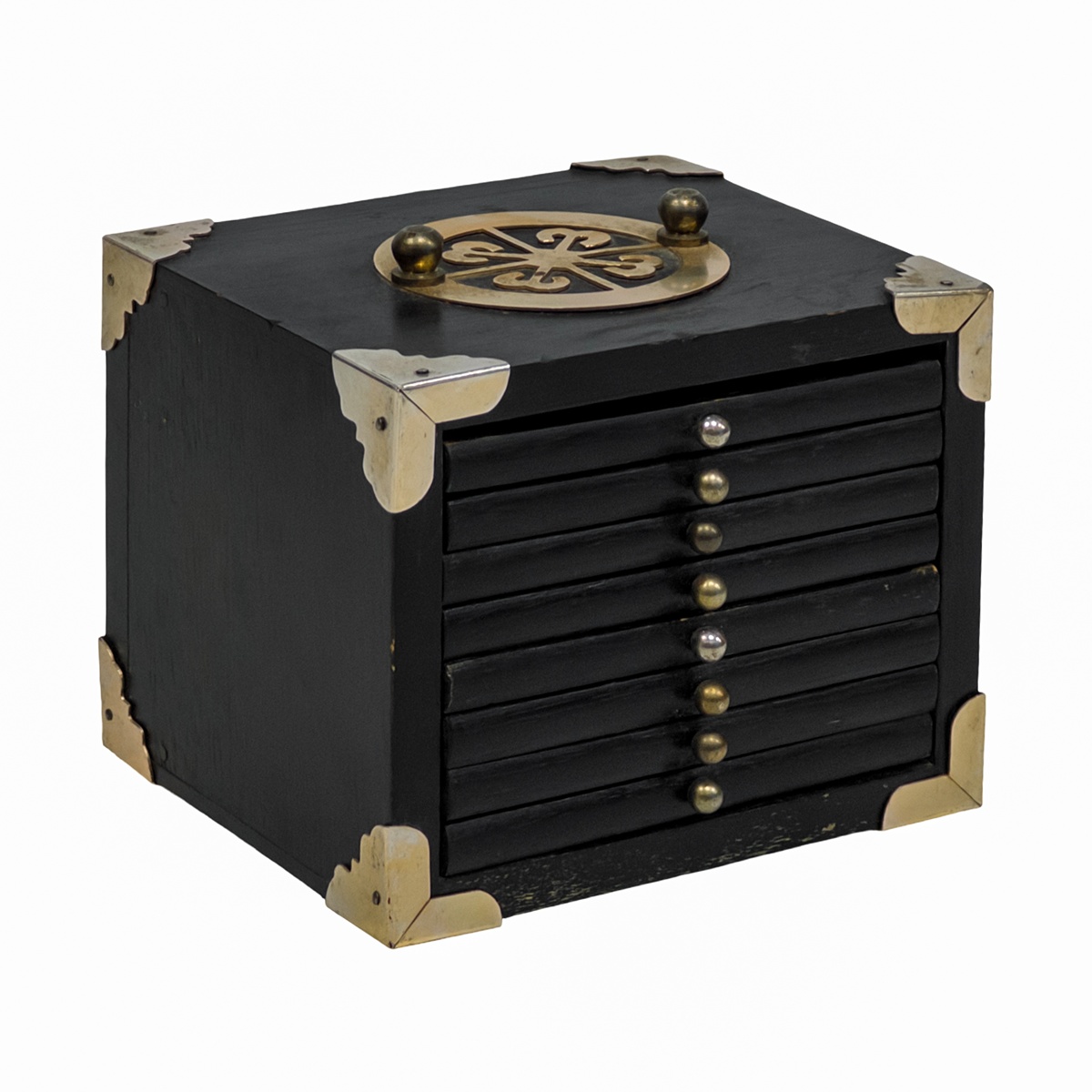 Coaster Set; Vintage, black wood box, ornate brass trim