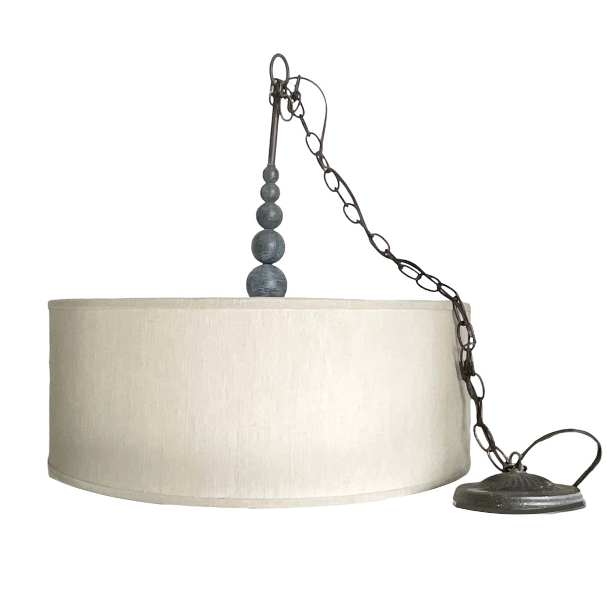 Pendent Lamp; Turned metal, blue patina with grey drum shade,