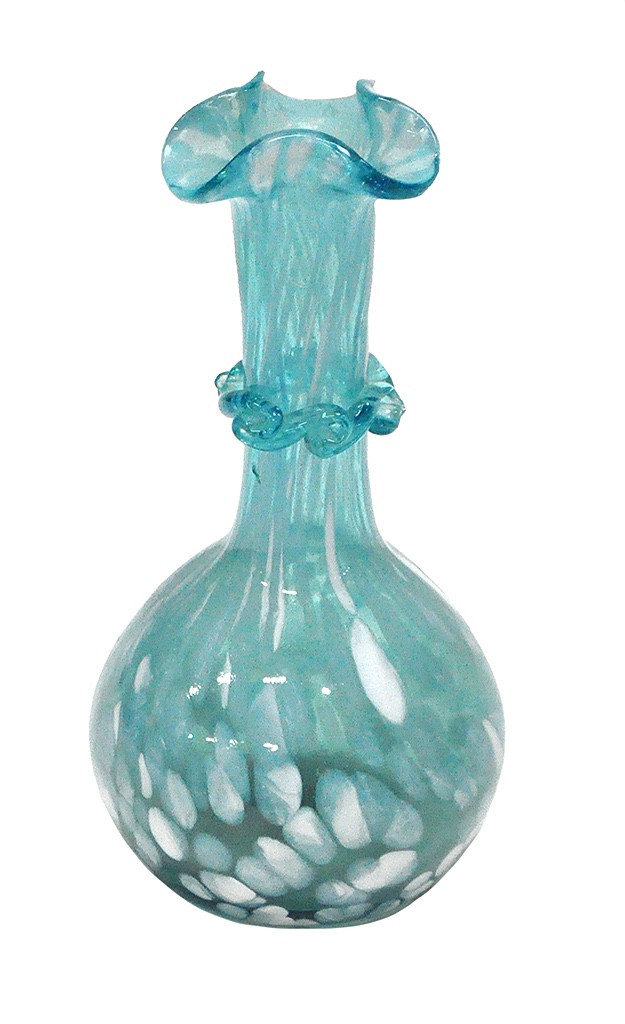 blue/green & white spotted hand blown glass, flared lip