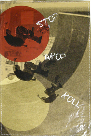 Skateboarder mid-trick with a multi-tonal green background with a red accent circle in top left corner. Reads "Stop Drop Roll" in white font...