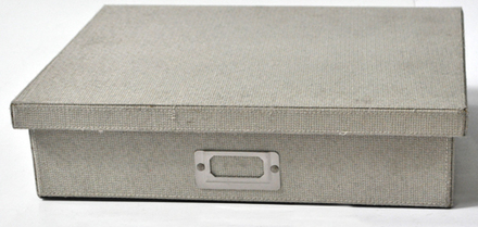 oatmeal linen with lined black leather steel label holder, size: 14" x 11" x 4" H