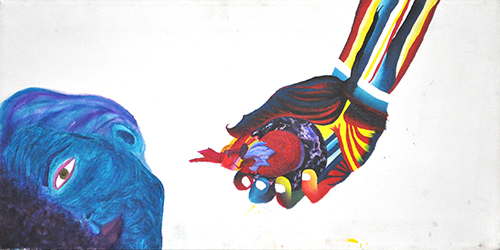 Cleared painting on canvas; expressionist pear offering