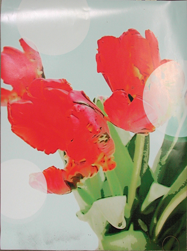 Light blue background with red overexposed tulips. Green leaves and white circles throughout.