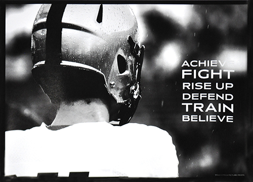 Black and white image of a football player wearing a white jersey and a football helmet with droplets on it. Black, grey, and white abstract...