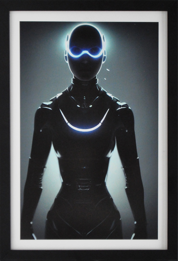 Cleared print on paper: robot wearing black body suit