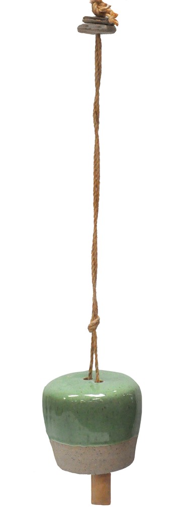 green speckled glaze, natural base, wooden ringing dowel, 16" rope, handmade pottery