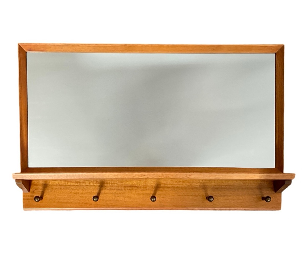 Entryway Wall Mirror; Solid wood, Pecan finish, shelf & 5 pegs,