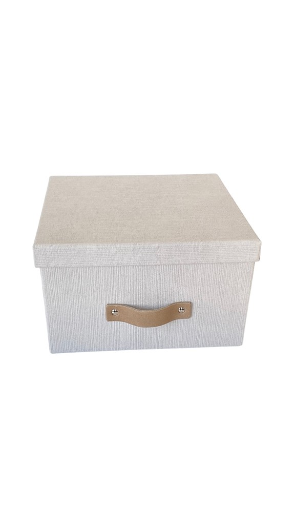 Photo Box; sand tone, tan leather side handle, silver rivets