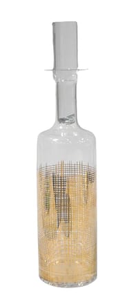 liquor bottle, glass with gold grid like pattern, heavy stopper. Size: 3.13"x13.5"H