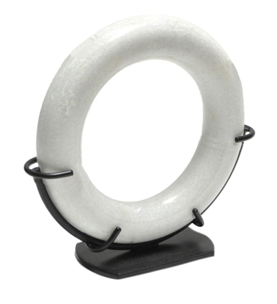 white alabaster open ring, black metal base 4 prongs on rectangle stand