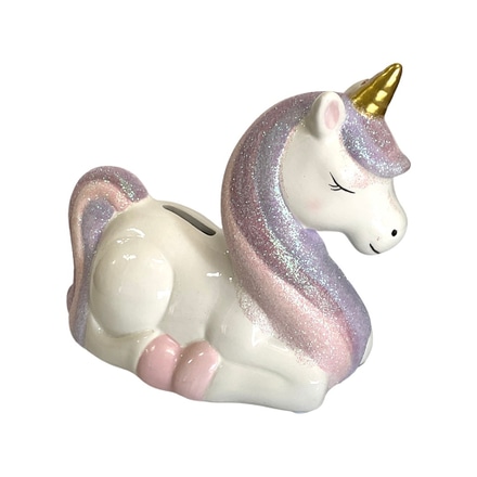 Money bank; unicorn, ceramic, white with purple & pink main,