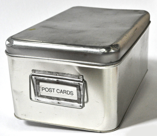 brushed steel with latching lid rounded corners. Size: 7"x10"x5"H