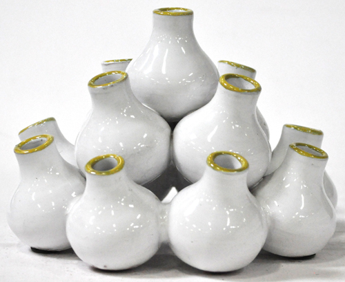 a bunch of mini ceramic vases stacked, white with yellow, green lip, size: 6" H