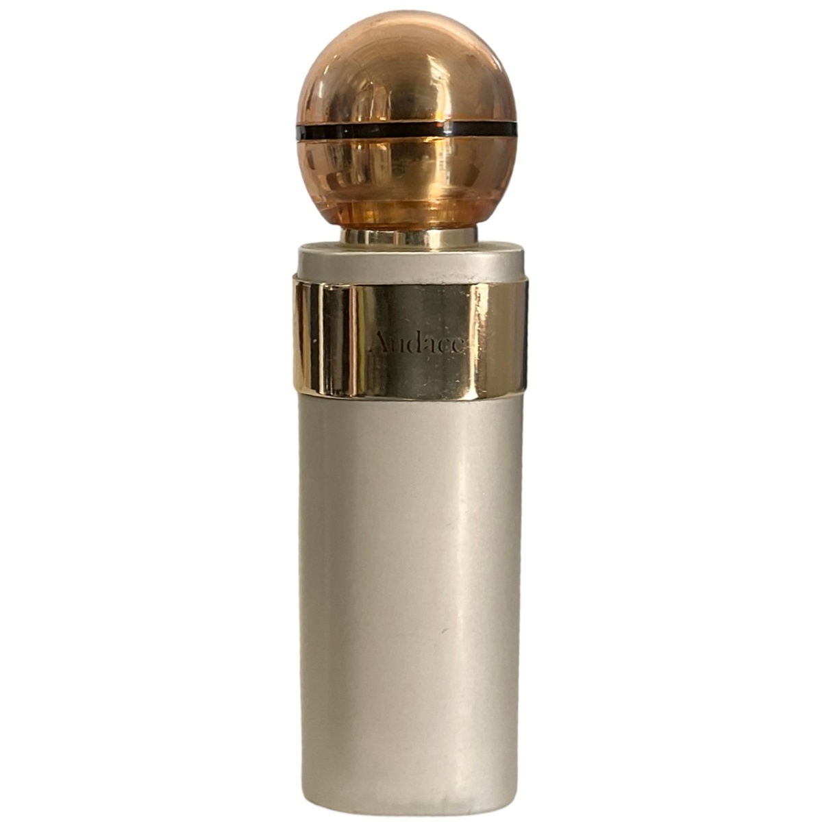 with gold trim, ball lid, inverted rectangle with rounded corners, semi filled, Circa 1970's, Audace Parfums ROCHAS.
