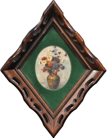 green mat, diamond shaped carved wood frame
