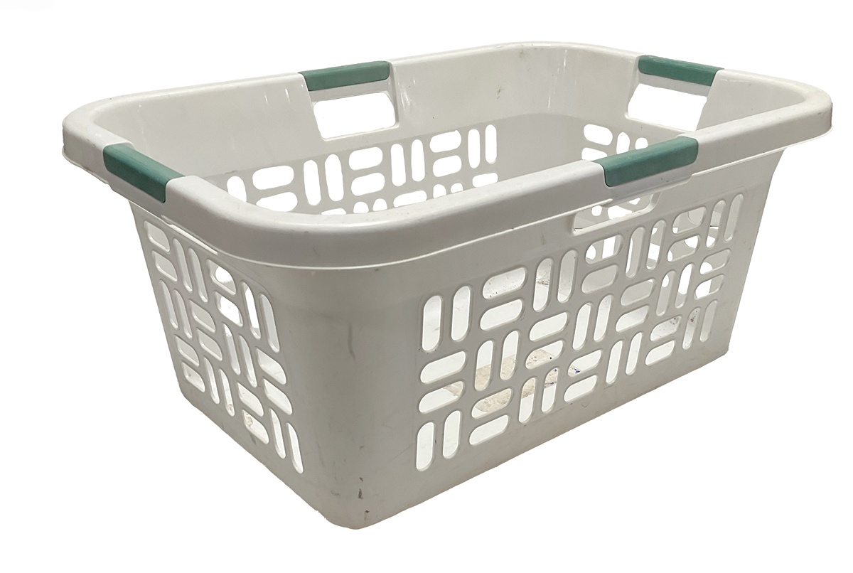 Laundry basket, white plastic with green handles