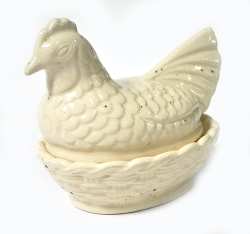rooster in basket, cream ceramic, 2 pcs. Size: 5"Hx6"L