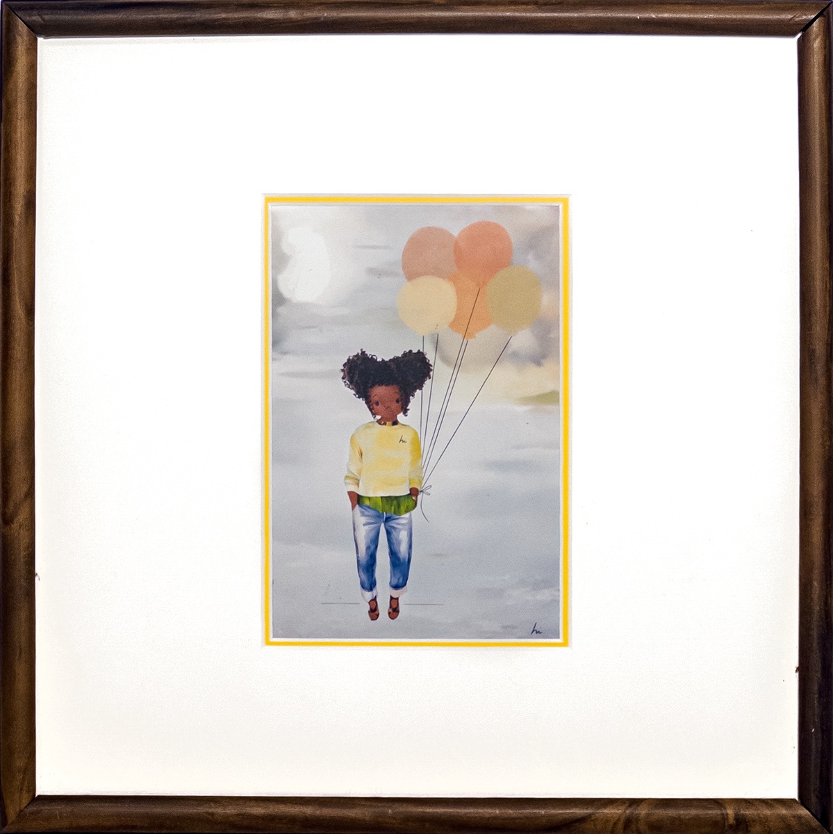 illustration of a girl wearing a yellow sweater and jeans, holding five orange/yellow balloons. blue-gray watercolor sky background. white m...