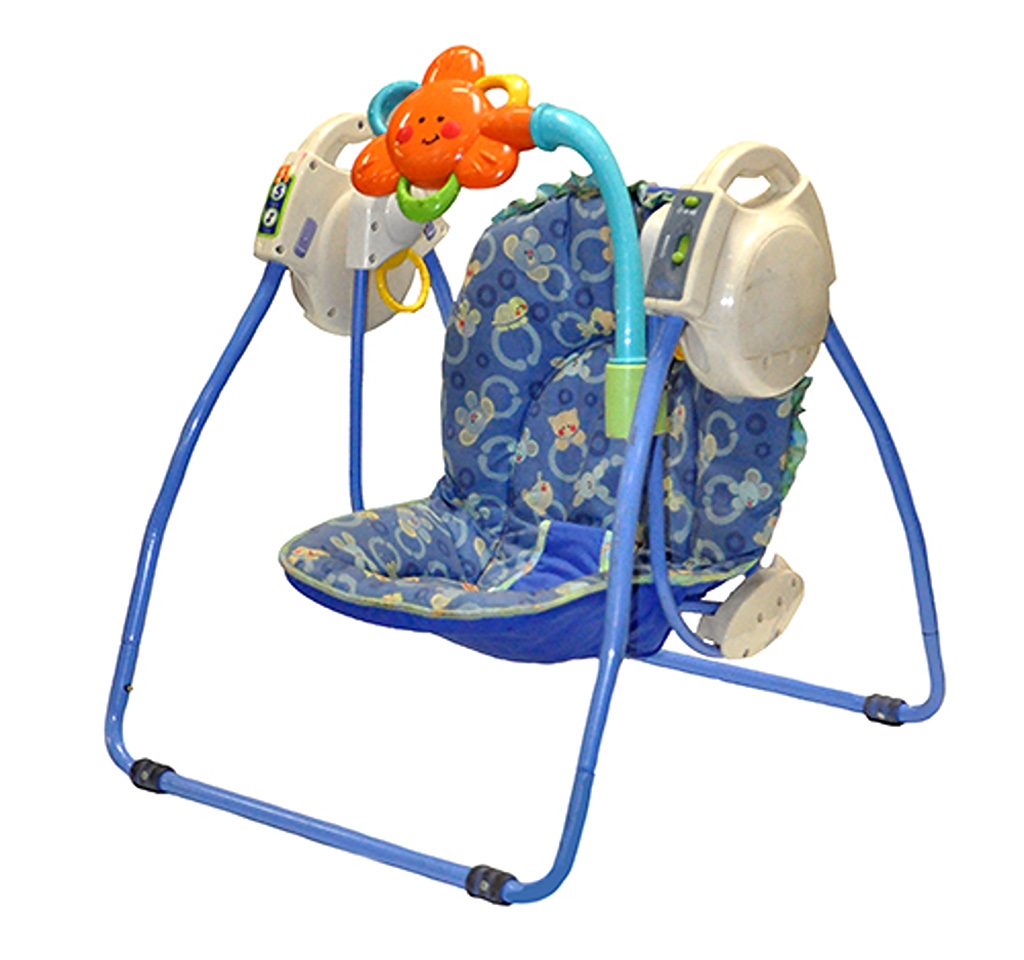 blue metal legs, blue fabric cover, with removable mirror. Size: 3"H