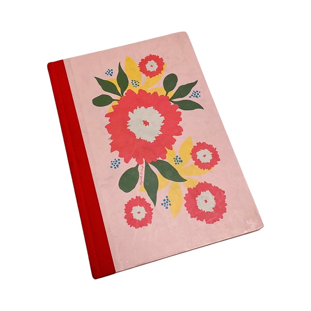 Notebook, Pink, Red binding; Red, yellow, and blue floral design