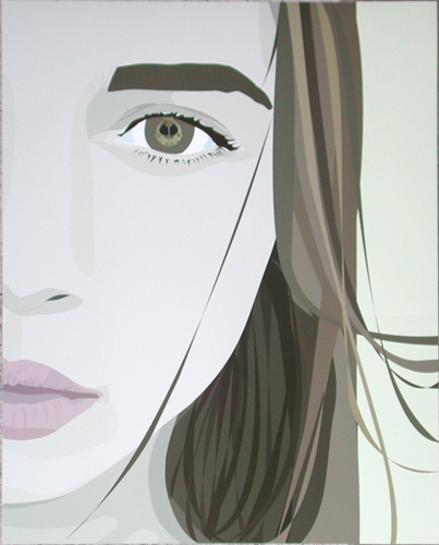 Half of woman's face looking at the camera. Brown eyes and brown hair. Cream and taupe tones throughout. Graphic/animation.