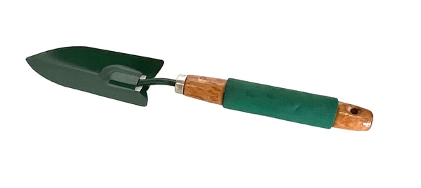Garden trowel, green metal blade and foam handle on wood