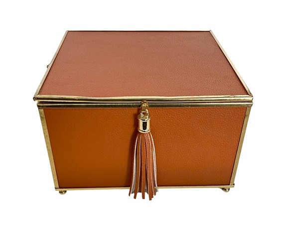 Vanity Box; deco, pebbled leather, conac, brass trim, hinged lid