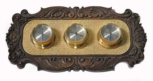 weather station, temp, barometer and humidity gauges on woven mat in carved brown wood frame