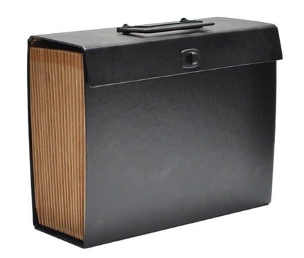 black with brown accordion slots, locking, with top handle