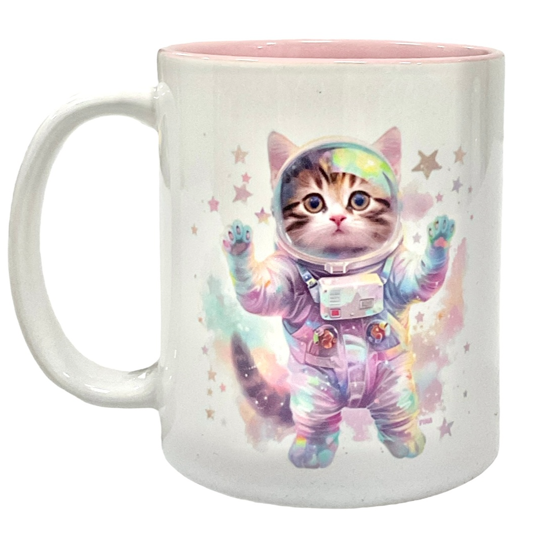 Mug; CLEARED Space Cat, multi colors on white cup,
