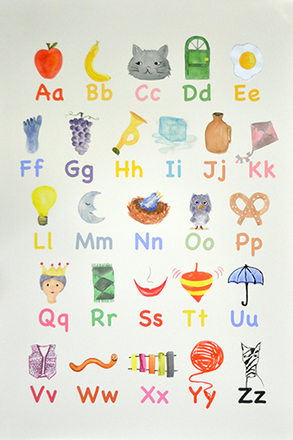 Beige background with multicolor rows of uppercase and lowercase letters. Each letter has a corresponding image like "Cc" for Cat.