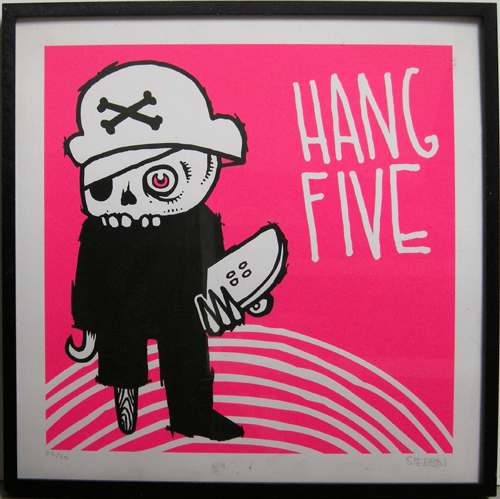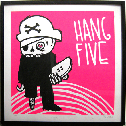 on with One Hook Arm and A Wooden Leg with A Pirate Hat on Pink and White in A Black Metal Frame