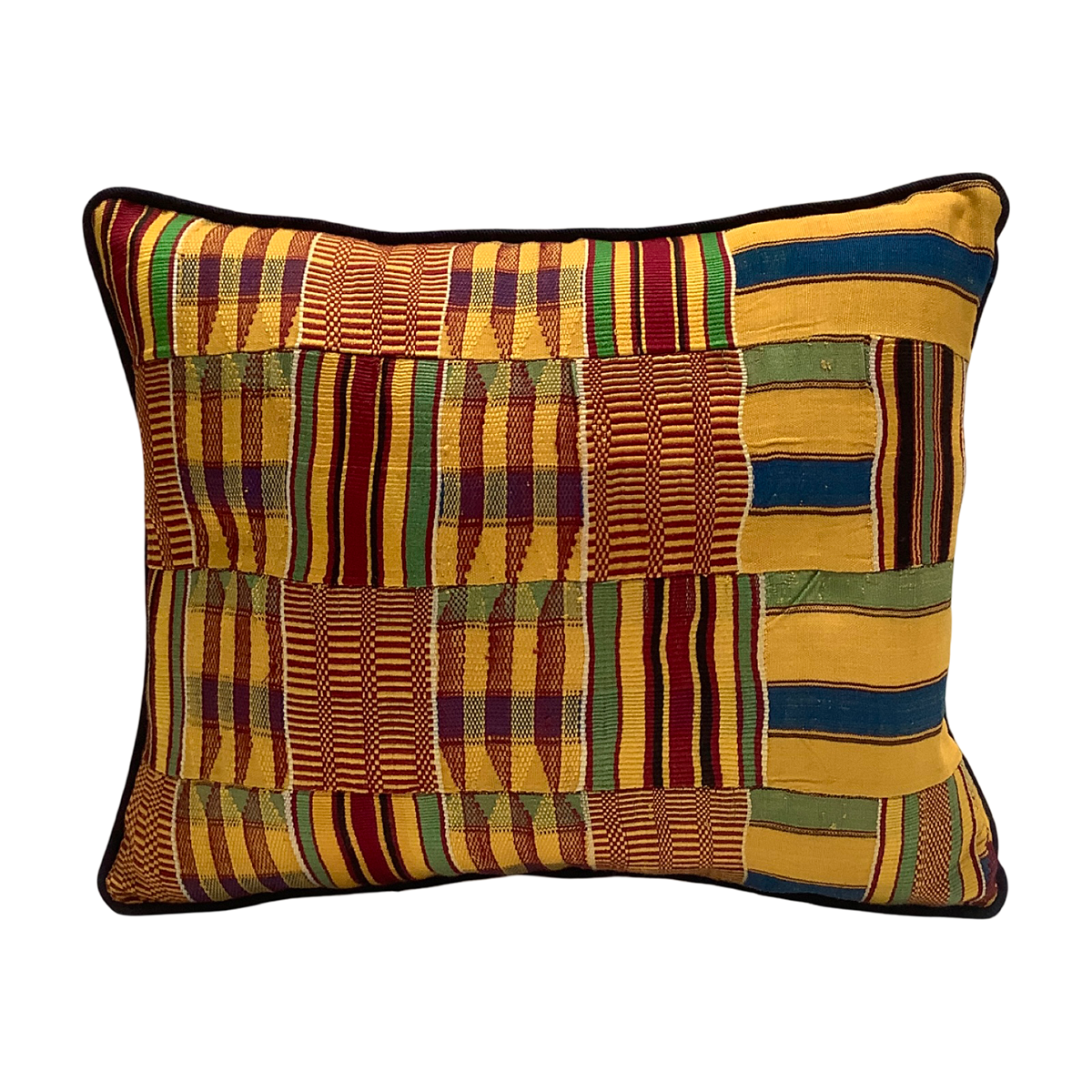 Various patterns, grid/quilt mismatched design, vertical stripes, horizontal stripes, yellow, maroon, black, blue, and green. Back of pillow...