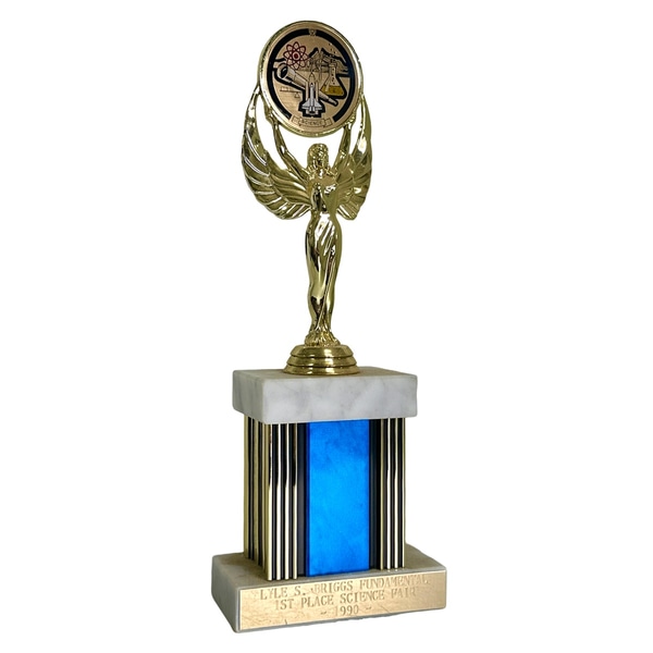 Blue & gold pillar, white marble pedestal, gold plaque, gold medallion featuring a rocket, telescope, and beaker