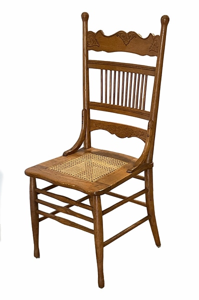 antique oak pressed-back chair with a caned seat