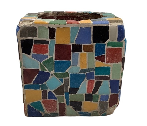 Pot; cement, covered in multicolor mosaic pieces,